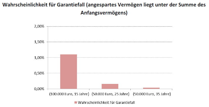 Das Risiko, dass der Garantiefall eintrifft, ist nicht gleichzusetzen mit dem Totalverlust des eingezahlten Kapitals. So betrug der durchschnittliche Verlust in den Berechnungen über 15 Jahre 8.000 Euro, der maximale Verlust lag unter 50.000 Euro.