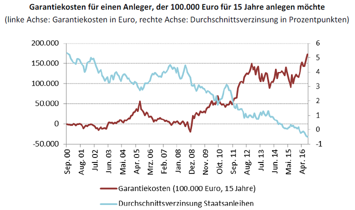 Die Kosten zur Absicherung einer Garantie von 100.000 Euro stiegen nach den Berechnungen der Studie über eine Laufzeit von 15 Jahren auf rund 170.000 Euro, also das 1,7-fache des eingezahlten Betrages. Und je länger die Garantie greift, desto höher sind die Kosten: Bei 25 Jahren betragen sie das Vierfache, bei 35 Jahren sogar das Achtfache der eingezahlten Summe.