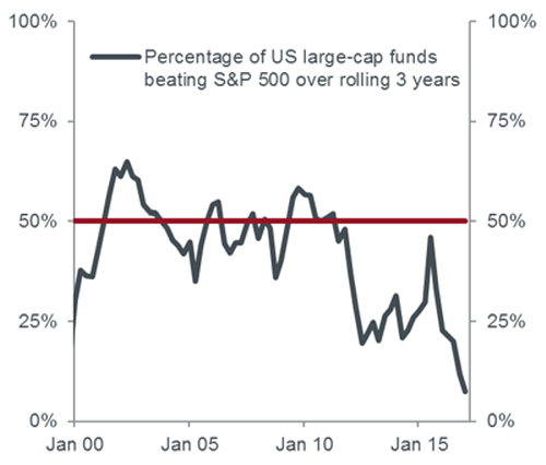 Lower cost passive investing strategies have undeniably reaped rewards during the post-financial crisis years.Super-easy monetary policy has propelled markets ever higher and this has meant a difficult environment for active stock-picking strategies when correlations increase and almost every asset rises.Clearly there have been successful strategies, particularly those invested in high quality growth stocks. However, in aggregate, the active management universe has had to fight hard to deliver outperformance. This is best observed in the highly competitive US equity market, where the majority of US large-cap managers have underperformed the S&P 500 index over the past three years net of fees (chart 1).