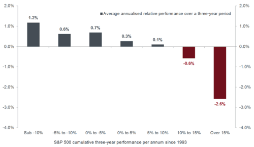 Overall given current market levels and valuations, it is hard to see the catalyst for another multi-year period of double-digit returns from developed market equities. This suggests the outlook for markets is likely to be one of increased volatility and lower returns that are harder to generate.An environment of lower and more volatile returns should provide attractive opportunities for those fundamental active managers who can forensically identify the corporate outlook for companies and navigate challenging markets appropriately. A more challenging market backdrop has historically coincided with positive relative performance contributions from active managers, even in the historically tough-to-beat US equity market, as shown in chart 5.