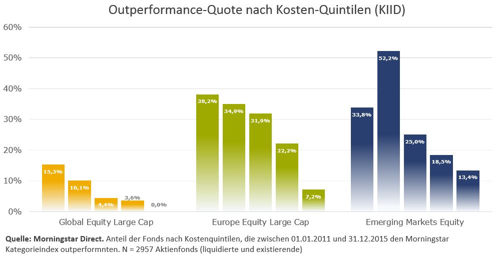 Die unten abgebildete Grafik zeigt Aktienfonds der Großgruppen Standardwerte weltweit (gelb), Standardwerte Europa (grün) und Aktien Schwellenländer (dunkelblau). Die jeweils fünf Balken repräsentieren laufende Fondskosten (KIID). Im linken Balken finden sich die nach Rangordnung 20% günstigsten Fonds je Großgruppe, der zweite Balken von links enthält die jeweils zweitgünstigsten Fonds, und so weiter. Die Höhe der Balken gibt die Prozentzahl der Fonds an, die seit Januar 2011 bis Ende Dezember 2015 ihren Morningstar Kategorie-Index outperformt haben.