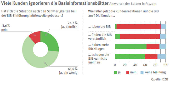 Doch Aufbau, Inhalte und Struktur der Dokumente sind offensichtlich am durchschnittlichen Privatanleger vorbeigeplant worden. Beinahe 80 Prozent der Berater geben in der DZB-Umfrage an, dass ihre Kunden die Angaben im BIB nicht verstehen. Die Berater sind mit vielen Rückfragen konfrontiert. Das führt so weit, dass viele Kunden die BIB gar nicht mehr beachten (60 %). Das Ziel, mit den Basisinformationsblättern für mehr Transparenz und Verbraucherschutz zu sorgen, darf somit vorläufig wohl als verfehlt betrachtet werden.