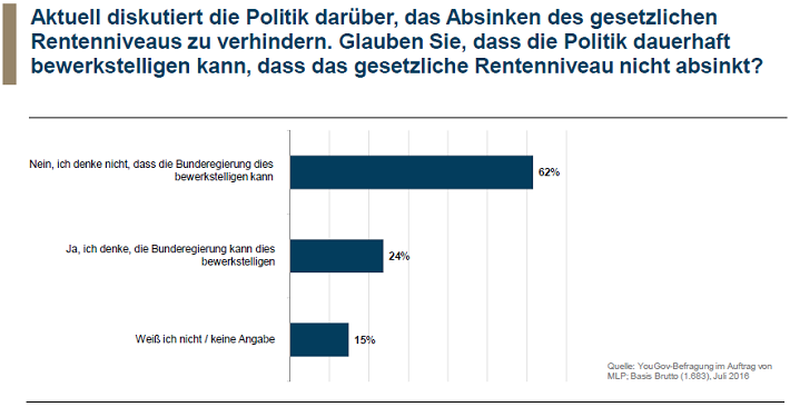 Wie skeptisch die Deutschen gegenüber den Rentenversprechen der Politiker sind, lässt sich auch an einer aktuellen MLP-Umfrage ablesen, die vom Institut YouGov durchgeführt wurde. Fast zwei Drittel der Befragten glauben, dass das gesetzliche Rentenniveau sinken wird. Lediglich 24 Prozent sind anderer Meinung.
