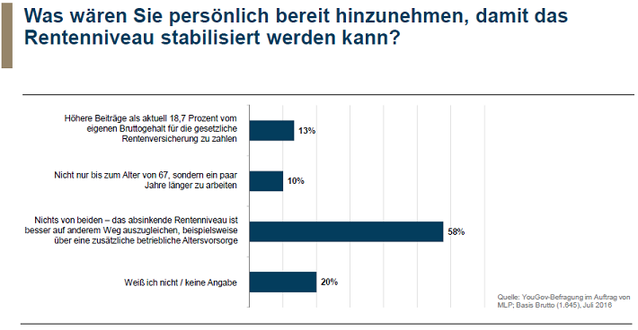 Lediglich zehn bzw. 13 Prozent der gesetzlich Rentenversicherten, die noch nicht im Ruhestand sind, wären dazu bereit. Stattdessen favorisieren 58 Prozent andere Wege zum Ausgleich des sinkenden Rentenniveaus, beispielsweise die betriebliche Altersvorsorge.