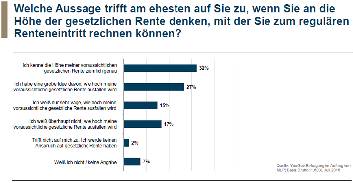 Die MLP Studie zeigt außerdem, dass es unter den Bürgern weiterhin darüber einen ausgeprägten Aufklärungsbedarf gibt, in welcher Höhe der Einzelne eine gesetzlichen Rente erwarten kann: 32 Prozent der Befragten haben keine konkrete Vorstellung davon, weitere 27 Prozent verfügen nur über eine grobe Idee. Berücksichtigt wurden hier nur Personen, die noch keine Rente beziehen.