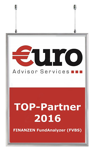 Jetzt bietet €uro Advisor Services den Lizenznehmern der Software eine wirksame Marketingunterstützung – das FVBS Top-Partner-Poster (Format: 59,4 x 84,1 cm) sowie das –set . Es zeigt der Laufkundschaft vor dem Schaufenster oder Interessenten im Office, dass die Berater und Büroinhaber exklusive Partner von €uro Advisor Services sind. Das Poster für 2016 ist ab sofort erhältlich. Lizenznehmer der Software FINANZEN FundAnalyzer (FVBS) erhalten es in zwei Varianten: Entweder das FVBS Top-Partner-Poster zum Preis von EUR 79.- Oder als FVBS-Top-Partner-Set. Das ist das Poster mit Deckenbefestigung, zwei Stahlseilen (á 1,50 m) sowie einem hochwertigen Rahmen. Preis hier: EUR 139.- Beide Preise jeweils zuzüglich Mehrwertsteuer und inkl. Verpackung und Versand. Infos und Bestellungen sind unter info@advisor-services.de oder telefonisch unter 089-2441-802-50 möglich.