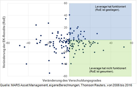 Ob eine höhere Verschuldung zumindest tendenziell zu höheren Eigenkapitalrenditen führt, kann nur eine Langzeitstudie mit vielen Unternehmen ermitteln. Zu diesem Zweck haben wir die liquidesten 150 europäischen Aktien nach der Veränderung des Verschuldungsgrades in den letzten 10 Jahren analysiert und den Veränderungen der Eigenkapitalrendite gegenübergestellt. Das Ergebnis: Eine stark streuende Punktwolke. Weder optisch noch statistisch ist ein Zusammenhang erkennbar. Die Vermutung, dass die Aufnahme von Fremdkapital zu höheren Eigenkapitalrenditen bei Unternehmen führt, muss deshalb verworfen werden. Es ist ein Mythos.