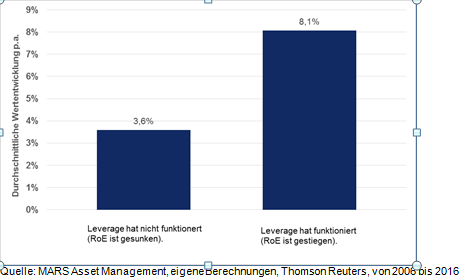 Spannend ist auch, wie Aktionäre die Aufnahme von Krediten und deren Unternehmenserfolg bewerten. Wir haben deshalb die Wertentwicklung der Aktiengruppen (=Quadranten der ersten Grafik) gemessen. Die Unternehmen, bei denen der Leverage-Effekt funktionierte (RoE ist gestiegen), haben eine durchschnittliche Performance von 8,1 Prozent p.a. in den letzten 10 Jahren erzielt. Ist die Eigenkapitalrendite mit dem höheren Verschuldungsgrad dagegen gesunken, fiel die durchschnittliche Aktien-Performance auf 3,6 Prozent p.a. herab.