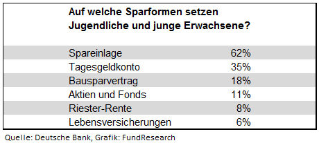 Bei den Sparformen setzen die jungen Menschen auf Bewährtes: Die Spareinlage, also Sparplan, Sparbuch oder Sparcard, ist mit Abstand am beliebtesten – 62 Prozent der Befragten nutzen sie. Es folgen das Tagesgeldkonto (35 Prozent) und der Bausparvertrag (18 Prozent). Aktien und Fonds werden von 11 Prozent genutzt, die Riester-Rente von 8 Prozent und Lebensversicherungen von 6 Prozent.