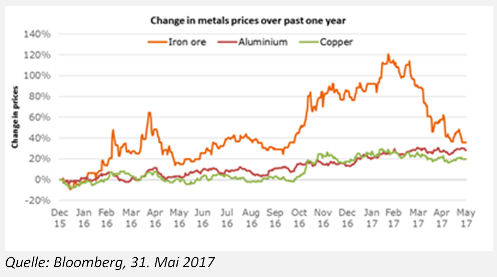 Die Kupferpreise erhielten durch ein reduziertes Angebot Unterstützung, unter anderem da Grasberg, die drittgrößte Kupfermine der Welt, streikte. Gleichzeitig stieg die Nachfrage nach Kupfer, nicht zuletzt aufgrund Chinas Politik, den Verkauf von Elektrofahrzeugen anzukurbeln (jedes Elektroauto benötigt mehr als 90 Kilogramm Kupfer). Die Aluminiumpreise blieben ebenfalls fest, nachdem Chinas Umweltschutzbehörde eine Richtlinie für Produzenten in 28 Städten erließ, die Produktion im Winter zu kürzen. Eisenerz schoss 2016 um 80 Prozent in die Höhe, als Reaktion auf die Entscheidung der chinesischen Regierung, die Kohleproduktion zu drosseln. Beide Rohstoffe werden bei der Stahlerzeugung benötigt.