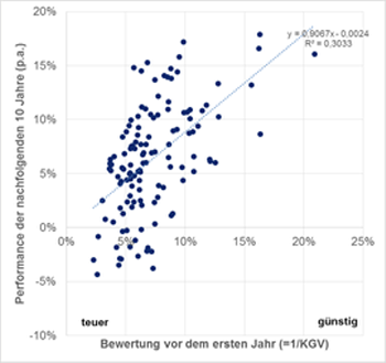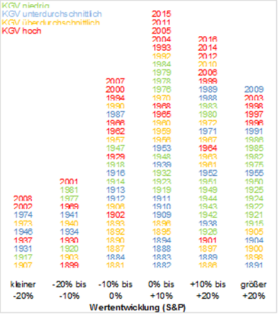Aktienmärkte erzielen offensichtlich hohe Wertentwicklungen, wenn die Bewertung (KGV) niedrig ist. Die größten Verluste werden dagegen in den Kalenderjahren erzielt, in denen ein hohes Kurs-Gewinn-Verhältnis vorliegt. Doch keine Regel ohne Ausnahme. In vielen Jahren korrespondieren Wertentwicklungen und Bewertungen nicht miteinander. So stiegen in den Jahren 1996 bis 1999 Aktienmärkte trotzt hoher Bewertung kräftig, während 1917 trotzt eines niedrigen KGV kräftige Kursverluste auftraten. Auf lange Sicht von 10 Jahren besteht jedoch ein unbestreitbarer Zusammenhang zwischen Bewertungen und Performance.