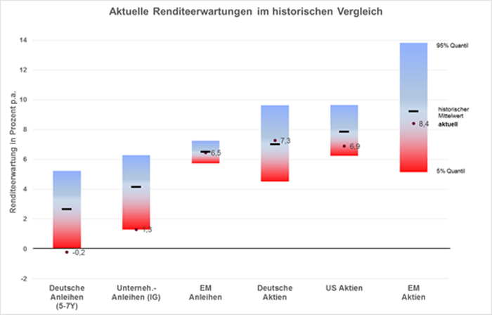 Aktuell sind die Renditeerwartungen deutscher Staatsanleihen und Unternehmensanleihen guter Bonität unterhalb der historischen Spannweite und stellen Extremwerte im sogenannten 0-5% Quantil aller historischen Beobachtungen dar. Innerhalb der Anleihen können nur die Emerging Market Staatsanleihen in lokaler Währung mit Renditeerwartungen auf Höhe des historischen Mittels aktuell überzeugen.