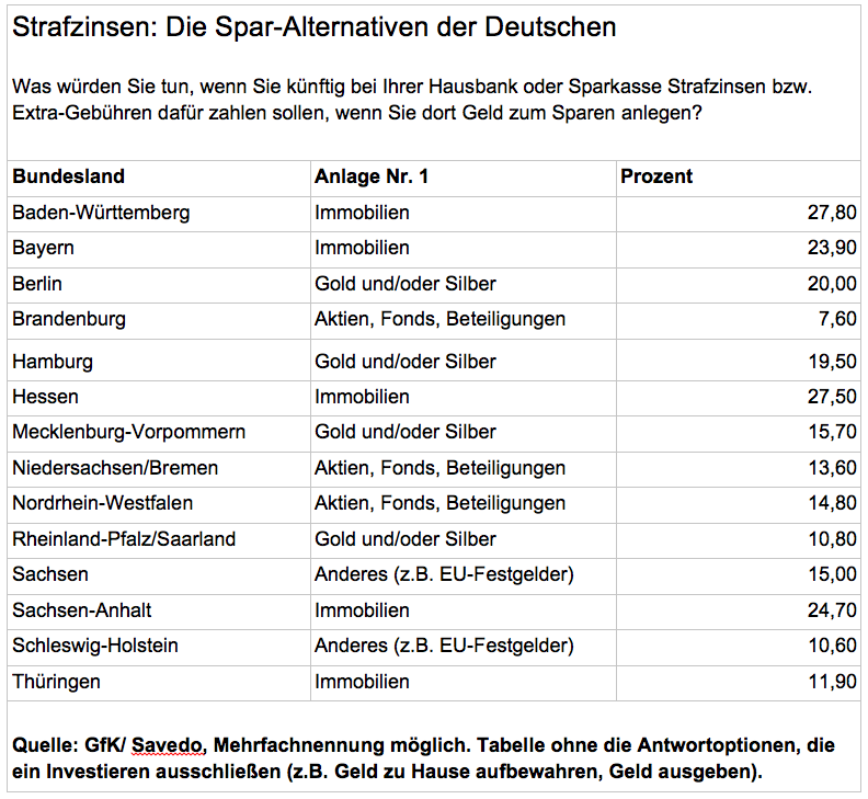 Nach Bundesländern ergibt sich ein differenziertes Bild. Dabei fallen besonders die Berliner und Hamburger auf, die mit hohen Prozentsätzen als erste Spar-Alternative bei Negativzinsen Gold und Silber sehen, siehe Tabelle: