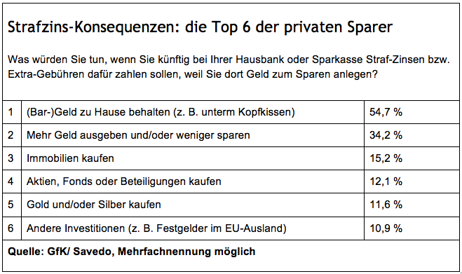 Laut GfK-Umfrage gaben rund 55 Prozent der Befragten an, im Fall von Negativzinsen das Ersparte wie zu Großmutters Zeiten unterm Kopfkissen oder anderen Verstecken zu Hause horten zu wollen. Wenn sie darüber hinaus investieren wollen, wären dies die Top 3: