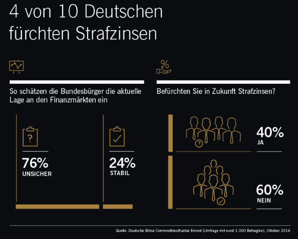 Für einen großen Teil der deutschen Sparer wären Strafzinsen keine Überraschung mehr. Laut einer emnid-Umfrage aus dem Oktober fürchten 40 Prozent der Deutschen, dass sie auf Sparguthaben künftig Zinsen an die Bank zahlen müssten. Erstaunlich: 37 Prozent wollten der Umfrage zufolge trotzdem immer noch frei verfügbares Kapital in Spareinlagen anlegen. Immerhin 36 Prozent wollten Gold kaufen. „Nur wenige ziehen aber daraus Konsequenzen und schichten ihr Kapital auf alternative Anlagen um“, kommentiert Michael König, Geschäftsführer der Deutsche Börse Commodities GmbH, die Umfrageergebnisse.
