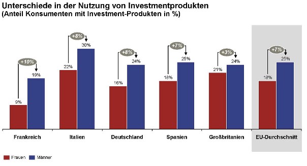 Frauen investieren weniger in Aktien, Anleihen oder Fonds als Männer. Das ist das Ergebnis einer aktuellen Studie der Unternehmensberatung A.T. Kearney in Zusammenarbeit mit dem Research-Haus YouGov, in der europaweit 6.000 Menschen nach ihren Finanzgewohnheiten befragt wurden. Im Hinblick auf die einzelnen Produktkategorien ergeben sich große Unterschiede: Während in Europa jeder vierte Mann in Investmentprodukte investiert, legt nur jede sechste Frau ihr Geld in Aktien, Anleihen oder Fonds an. Den Grund dafür erkennt die Studie darin, dass Männer sich in Finanzdingen häufig für gebildeter halten und der Rendite wegen eher bereit sind, Risiken einzugehen. Frauen seien hingegen tendenziell vorsichtiger oder orientierten sich an nachhaltigen Kriterien.