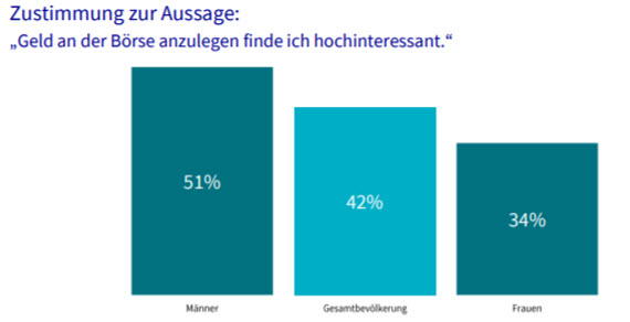 Bei den Männern vertritt sogar jeder Zweite diese Meinung. Unter Frauen sind Börsenspekulationen dagegen weniger beliebt. Nur 34 % gaben an, Geldanlage an der Börse für interessant zu halten.