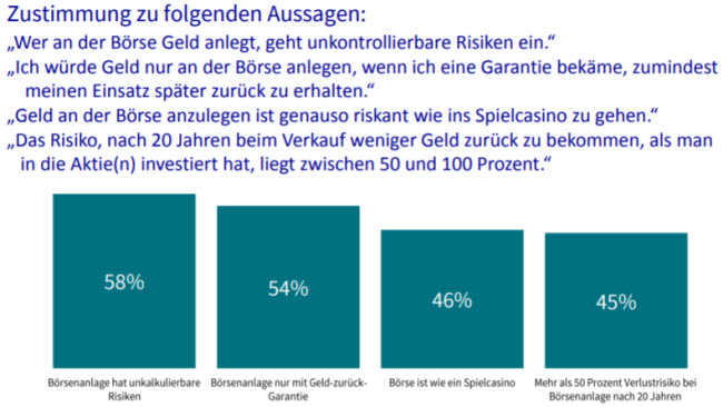 Grund für die Zurückhaltung beim Gang an die Börse ist das Gefühl mangelnder Kontrolle Einerseits ist unter Deutschen die Meinung weit verbreitet, an Börsen könnten nur Experten Geld verdienen. Vier von zehn Deutschen würden gern an der Börse investieren, lassen es aber, weil sie der Überzeugung sind, dass ihnen das nötige Fachwissen fehlt, um an der Börse erfolgreich zu sein (Männer 43 %, Frauen 38 %). Diese Einschätzung spiegelt sich auch in der Zustimmung zur Aussage wieder, eine Geldanlage in börsengehandelte Wertpapiere überlasse man besser Experten. Sechzig Prozent der Gesamtbevölkerung denken so. Unter den Teilnehmerinnen der Befragung waren es sogar knapp zwei Drittel. Andererseits denken 58 % der Befragten, an der Börse lauerten unkontrollierbare Risiken. Fast die Hälfte (46 %) sieht keinen Unterschied zwischen dem Risiko eines Börseninvestments und dem Gang ins Spielcasino. Fast ebenso viele (45 %) hängen dem Glauben an, das Verlustrisiko einer Börsenanlage liege nach 20 Jahren über 50 %. In der Konsequenz gaben 54 % der Deutschen zu Protokoll, nur dann an der Börse investieren zu wollen, wenn sie eine Garantie für ihre Geldanlage erhalten.