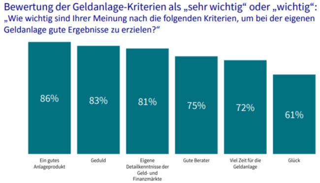 Bedingung für ein erfolgreiches Investment ist nach der Überzeugung der Mehrheit (86 %) vor allem ein gutes Anlageprodukt. Als zweites entscheidendes Kriterium nannten die Befragten Geduld (83 %). Tiefgehendes Wissen über Geld- und Finanzmärkte (81 %) schätzten die Deutschen ebenfalls als „wichtig“ oder „sehr wichtig“ ein. Gut 61 % der Interviewten hält schlichtes „Glück“ für den entscheidenden Faktor.