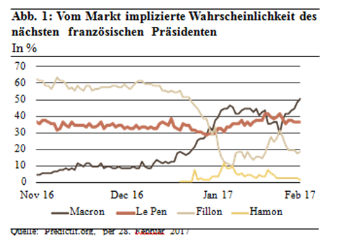 Trotz der zunehmenden politischen Unsicherheit in den USA und in Europa verharren gängige Indikatoren für die Anlegerängste, wie der VIX, auf Mehrjahrestiefs. Diese Diskrepanz gibt Anlass zu der Frage, in welchem Grad die Finanzmärkte diese Risiken angemessen berücksichtigen. Was Frankreich betrifft, scheint die Wahrscheinlichkeit, welche die Anleger einer Präsidentschaft von Le Pen beimessen (siehe Abb. 1) in etwa mit unserer Einschätzung von 40% übereinzustimmen.