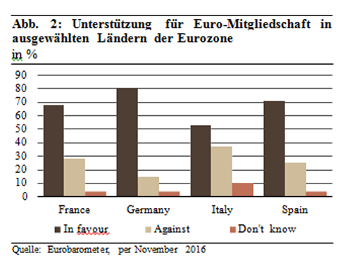 Verfassungshürden und der Wunsch der Öffentlichkeit, den Euro zu behalten (siehe Abb. 2) resultieren in einer erheblich geringeren Wahrscheinlichkeit, dass Frankreich tatsächlich aus der Währungsunion austritt («Frexit»), selbst wenn Marine Le Pen Präsidentin wird. Wir messen einer Kette von Ereignissen, die tatsächlich zu einem Austritt Frankreichs aus der EWU führen würden, nur eine Wahrscheinlichkeit von 10% bis 20% bei. Die Anlageklassen, die am meisten davon betroffen wären, scheinen diesen erhöhten, aber immer noch geringen Grad der Marktnervosität widerzuspiegeln. Zum Beispiel haben sich die Risikoprämien französischer Staatsanleihen gegenüber deutschen Bundesanleihen vorübergehend auf ihre höchsten Niveaus seit der Eurokrise von 2012 ausgeweitet (82 Basispunkte (Bp.) am 22. Februar). Sie liegen aber deutlich unter dem Niveau von 150 Bp., das wir erwarten würden, sollte Marine Le Pen die Präsidentschaftswahl gewinnen. Nachfolgend legen wir eine Liste von Anlagevorschlägen für Anleger vor, die sich gegen ein solches Szenario absichern möchten.