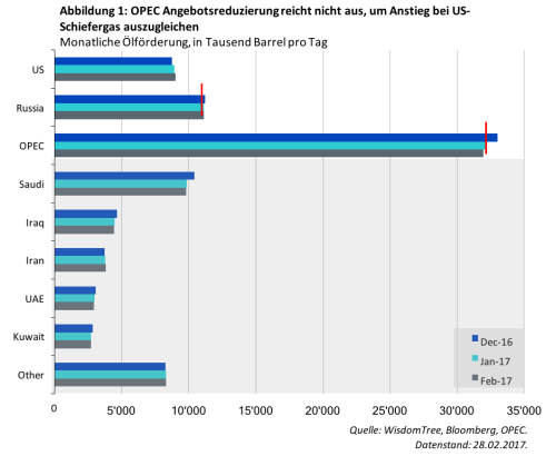 Angesichts des erhöhten Angebotsdrucks wird die OPEC gezwungen sein, die aktuellen Angebotsvereinbarungen zu verlängern und/oder eine bessere Einhaltung der Angebotsziele durchzusetzen, um damit Unterstützung für höhere Ölpreise zu liefern. Diese Maßnahme wird wahrscheinlich auf der Haupttagesordnung beim nächsten Treffen der OPEC am 25. Mai 2017 stehen. Dabei werden die Fördermengen für den Iran und Nigeria, die beide in den letzten Monaten gestiegen sind, höchstwahrscheinlich auf den Prüfstand gestellt. Des Weiteren spielt auch die langsame Reduzierung der Fördermenge durch Russland beim Finden eines Gleichgewichts zwischen wirtschaftlichen Bedürfnissen und der Steigerung der Ölpreise eine Rolle.