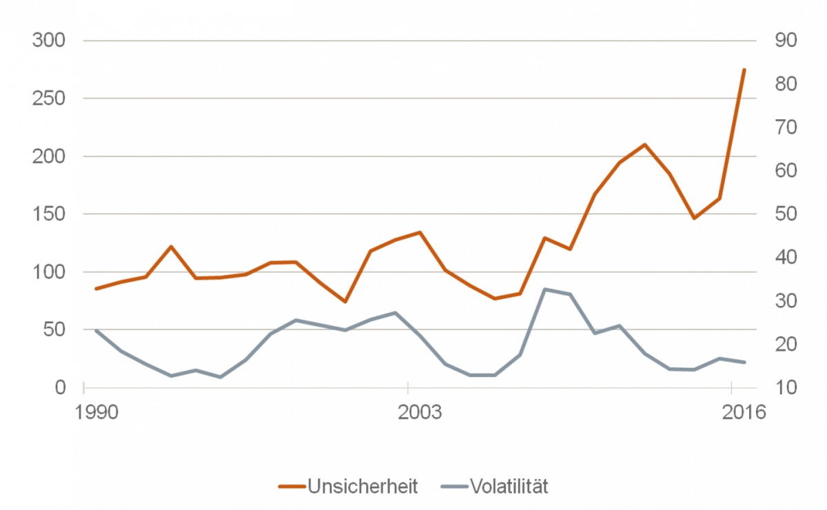 Seit 2010 hat sich das geändert. Die Unsicherheit stieg drastisch an, zuerst wegen der Eurokrise, dann wegen des Brexit-Referendums und der Wahl von Donald Trump. Gleichzeitig ging die Volatilität der Märkte aber zurück. Die Aktienkurse haussierten.