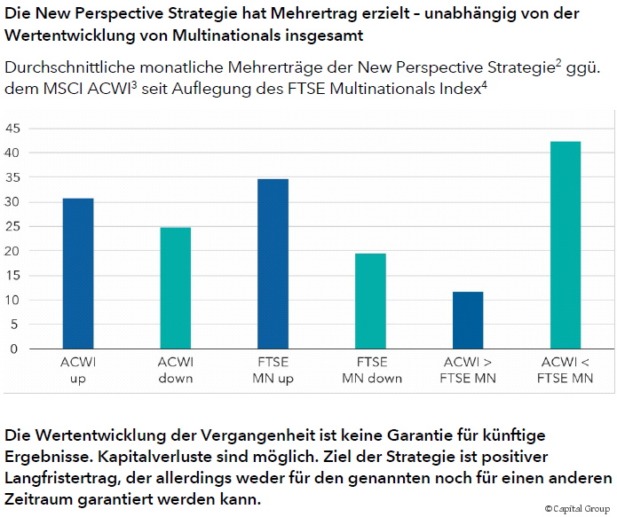 Unabhängig von der Strategie können unsere Portfoliomanager und Analysten gezielter investieren, wenn eine gewisse Vorauswahl stattfindet – etwa durch die Konzentration auf Multinationals. Noch wichtiger als die Festlegung des Anlageuniversums ist aber der nächste Schritt: Jetzt geht es darum, durch den Investmentprozess und die Einzelwertauswahl Mehrwert zu erzielen. Betrachten wir dazu einmal den FTSE Multinationals Index. Seit seiner Auflegung hat er den MSCI ACWI um jährlich etwa einen Prozentpunkt hinter sich gelassen, und die New Perspective Strategie war sogar noch besser. Multinationals verzeichnen meist höhere Gesamterträge. Wirklich spannend ist aber, was unsere Portfoliomanager (und die Analysten in ihrem Researchportfolio) tun, um auch den FTSE Multinationals zu schlagen. Ein Blick auf die Zahlen zeigt, dass Multinationals keineswegs jedes Jahr vor der Benchmark lagen. Auch jetzt dürften die Zeiten für Multinationals eher schwieriger sein.