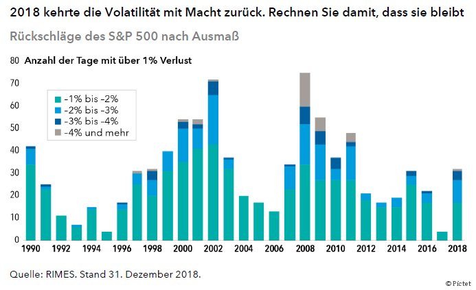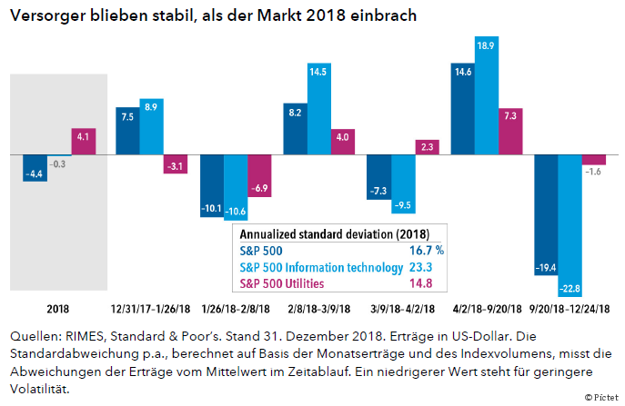 Nirgendwo waren die Kursschwankungen letztes Jahr stärker als bei den Aktien führender Technologiekonzerne. Dazu zählen auch die FAANGs (Facebook, Amazon, Apple, Netflix und Google-Eigentümer Alphabet). Beim Auf und Ab der Märkte standen Technologieaktien stets an der Spitze. 2019 haben sich die großen Technologie- und Konsumgüterwerte – wie der Gesamtmarkt – bislang aber wieder gut erholt. Dennoch sollten Investoren vorsichtig bleiben, da die Spätphase des US-Konjunkturzyklus, die ungelösten Handelskonflikte und das schwächere Gewinnwachstum durchaus für anhaltend unruhige Märkte sorgen könnten.