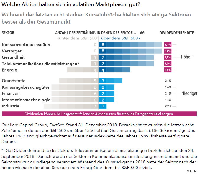 Die Kraft der Diversifikation Einige der defensiveren dividendenstarken Titel am Markt haben sich 2018 recht gut gehalten. Beispielsweise ließ der Versorgersektor in allen drei sehr volatilen Marktphasen den Gesamtmarkt hinter sich. Trotz Mindererträgen in Zeiten steigender Kurse verzeichneten Versorgertitel im Gesamtjahr einen Gewinn, und das bei einer vergleichsweise niedrigen Volatilität. Unternehmen aus vielen Sektoren und Branchen sorgen mit einem beeindruckenden Produkt- und Dienstleistungsangebot für Gewinn. Betrachten wir dazu acht große Markteinbrüche seit 1987. Dabei zeigt sich, dass viele der Sektoren, die sich in diesen Zeiten gut hielten, hohe Dividenden zahlten.