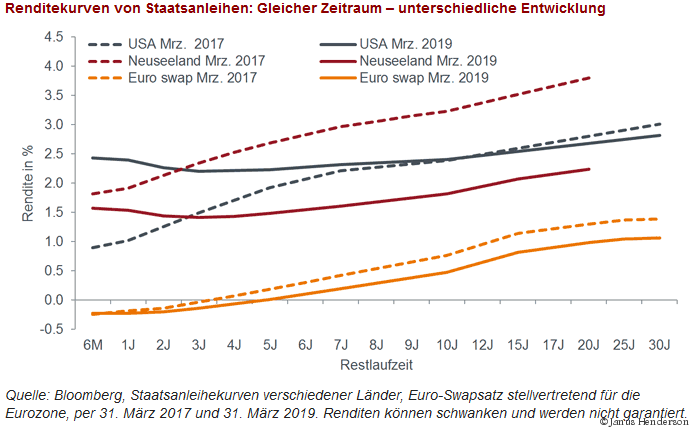 Wer als Anleger in der Lage ist, flexibel und frei von Anlagebeschränkungen zwischen verschiedenen Ländern umzuschichten, kann die Unterschiede zwischen ihren Renditekurven zu seinem Vorteil nutzen. Die folgende Grafik zeigt, wie sich Renditekurven in nur zwei Jahren in sehr unterschiedliche Richtungen bewegen können. So hat sich die US-Renditekurve abgeflacht, weil die Notenbank eine restriktive Geldpolitik verfolgt hat. In der zur gleichen Zeit steilen Renditekurve in der Eurozone spiegeln sich die dort negativen Zinsen wider. Unterdessen sind in Neuseeland die Zinsen deutlich von Niveaus zurückgefallen, die eine zu optimistische Einschätzung der Wirtschaft eingepreist hatten.