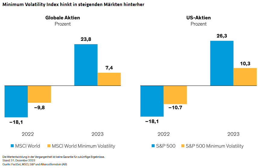 Als die globalen Aktien 2022 abstürzten, konnte der MSCI World Minimum Volatility Index („Min Vol“) die Rückgänge erfolgreich abfedern (Abbildung). Doch im Jahr 2023 zogen globale Aktien um fast 24 % an, was vor allem auf einige wenige US-Megatitel zurückzuführen war.