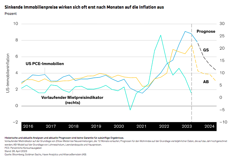 Der Immobilienmarkt war im vergangenen Jahr einer der hartnäckigsten Inflationstreiber, und wir sind zuversichtlich, dass der Anstieg zumindest der US-Hauspreise im Jahresvergleich seinen Höhepunkt erreicht haben könnte (Abbildung). Die Preissteigerungen beim Hauskauf und bei Neuvermietungen (grüne Linie), die sich mit einer Verzögerung von etwa einem Jahr in den Preisindizes (blaue Linie) niederschlagen, erreichten Anfang 2022 ihren Höhepunkt. Auf der Grundlage breiter Indikatoren und unseres eigenen Modells (gelbe Linie) gehen wir davon aus, dass sich die Immobilieninflation bis 2023 weiter normalisieren und eine wichtige Rolle bei der Inflationsbekämpfung spielen wird.