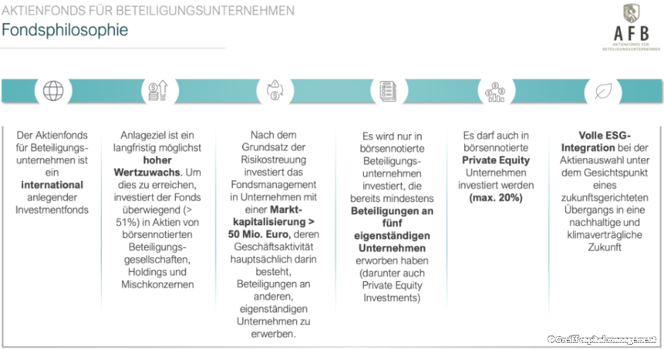Sein Fazit: Kombiniere man verschiedene börsennotierten Beteiligungsunternehmen miteinander in einem Portfolio, erhalte man ein großes Portfolio an unterbewerteten Titeln, die im Paket oft unter Substanzwert gehandelt würden. Anleger, die in den Artikel-8-Aktienfonds, aufgelegt bei der Greiff capital management AG, investierten, profitierten so nicht nur vom Wissen und den Strategien der einzelnen Beteiligungsunternehmen, sondern auch von deren verschiedenen Anlagestilen. Wichtig dabei: In dem Portfolio stecke viel Antizyklik. Denn die großen Player seien geübt darin, die Chancen zu erkennen und zu nutzen. Es sei schließlich ihr Kerngeschäft, kühlen Kopf zu bewahren.