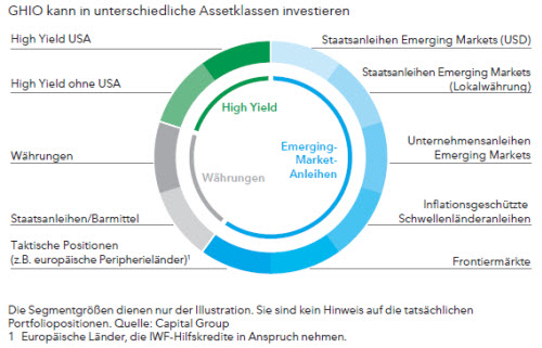Global High Income Opportunities (GHIO) ist eine Strategie, die die Capital Group vor über 15 Jahren zwei Assetklassen: High Yield und dollardenominierte Emerging-Market- Anleihen. Mit den Assetklassen hat sich auch die GHIO-Strategie weiterentwickelt. Heute ist GHIO ein internationales Credit-Portfolio, das vor allem auf unterschiedliche höherverzinsliche setzt. Dazu zählen und ohne Inflationsindexierung), Emerging- Market-Unternehmensanleihen sowie in allen denkbaren Währungen vgl. Abbildung unten).