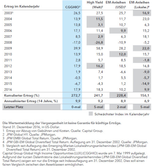 Strategien, die in weniger liquide Anleihen investieren, können bisweilen sehr erfolgreich sein. In schwachen Marktphasen können sie aber deutlich hinter liquideren Papieren liegen. Relative Erträge gegenüber den Assetklassen Die folgende Tabelle zeigt, dass der Capital Group Global High Income Opportunities (LUX) (CGGHIO) langfristig besser war als jedes der Marktsegmente, in die er investiert. Entscheidend für die höheren Erträge waren vor allem die Einzelwertauswahl und die flexible Asset-Allokation.