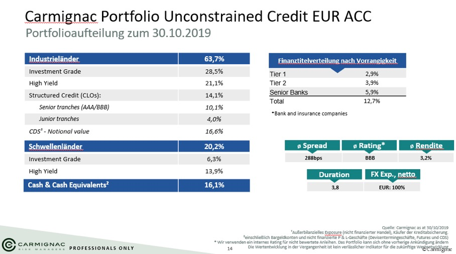 Pierre Verlés Strategie überzeugte das Management der Fondsgesellschaft in Paris so sehr, dass die Gründerfamilie sich entschied, den Carmignac Portfolio Unconstrained Credit aufzulegen – auch unterlegt mit eigenem Vermögen. Mit dem vor etwa eineinhalb Jahren aufgelegten Fonds, der zunächst nur als institutionelle Anteilsklasse mit einem Mindestinvestitionsvolumen von zwei Millionen Euro verfügbar ist, kann Verlé nun seine Rentenstrategie unabhängig vom Multi-Asset-Bereich umsetzen. Zusammen mit Alexandre Deneuville und Florian Viros, einem ausgewiesenen Experten im Bereich strukturierter Anleihen, setzt das erfahrene Management-Team auf Einzeltitel. Dabei können sich die Fondsmanager in einem großzügig abgesteckten Anleiheuniversum bewegen. Bis zu 25 Prozent der Papiere können in Anleihen aus den Emerging Marktes investiert werden, bis zu 50 Prozent an Hochzinsanleihen, bis zu 100 Prozent an Investment-Grade-Anleihen und bis zu 20 Prozent an strukturierten Anleihen sind möglich. Es ist ein in Euro abgesichertes Portfolio und unterliegt somit keinem Währungsrisiko.