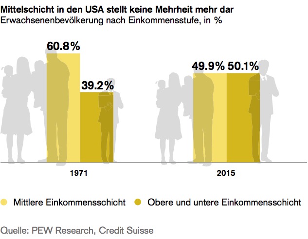 Seit der Finanzkrise 2008 haben die Ungleichheiten weltweit zugenommen, allerdings weniger zwischen den Ländern als vielmehr innerhalb dieser und vor allem in den Industrienationen. Der wirtschaftspolitische Mix aus steuerlichen Sparmassnahmen und sehr lockerer Geldpolitik, den die meisten Industrieländer zur Bewältigung der Krise verfolgen, erwies sich für die westliche Mittelschicht als besonders nachteilig. Infolge der Rezession war die Arbeitsmarktlage geprägt von beharrlich hohen Arbeits- losenquoten und stagnierenden Löhnen – eine Situation, die durch die ìHyperglobalisierung und umwälzende Technologien noch verschärft wurde. Dadurch fanden sich viele Haushalte der Mittelschicht nach der Krise in einer dauerhaft schlechteren Position wieder. In starkem Gegensatz dazu nahm das Vermögen der wohlhabendsten 1% der Haushalte gleichzeitig deutlich zu, wodurch innerhalb der westlichen Mittelschicht allgemein der Eindruck entstand, in den letzten acht Jahren selbst am schlechtesten abgeschnitten zu haben.