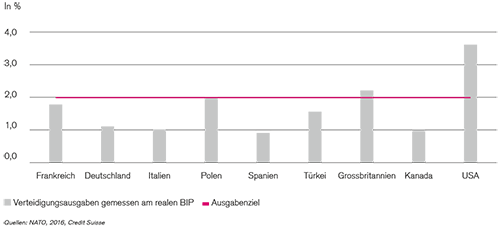 Von den grössten europäischen NATO-Mitgliedern erfüllen aktuell nur Grossbritannien und Polen dieses Ziel, Deutschland, Kanada und Spanien liegen erheblich darunter. Deutschland und Frankreich, die vor allem ihren Beitrag erhöhen müssten und dies zur Erreichung der NATO-Ziele auch zugesagt haben, machen rund 5 % der gesamten NATO-Verteidigungsausgaben aus. Ihr Ausgabenplus dürfte die Erträge europäischer Rüstungsunternehmen steigen lassen. Urbane Sicherheit, Verkehrssicherheit, Gesundheits- und Lebensschutz sind Top-Prioritäten. Auch der Markt für Heimatschutztechnologie dürfte dadurch rasch wachsen. Infrastrukturschutz und öffentliche Überwachung gehören zu den Bereichen, in denen IT-Hard- und Software (Drohnen, Roboter und KI-Algorithmen) ins Spiel kommen. Laut der Research- und Beratungsfirma MarketsandMarkets wird der Informationssicherheitsmarkt bis 2020 von USD 70 Mia. auf 170 Mia. zulegen.