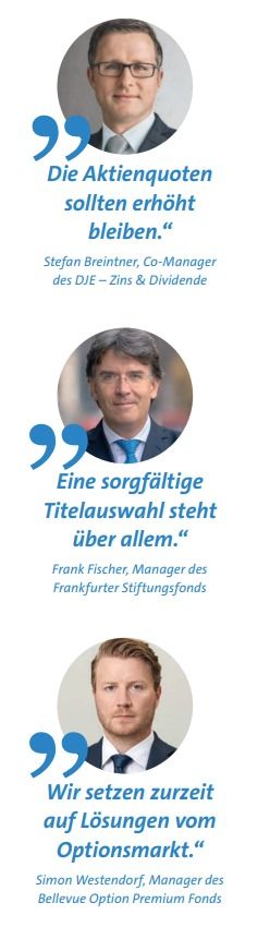 Die Anlagestrategen von Bellevue Asset Management, DJE Kapital und Shareholder Value Management reagieren mit verschiedenen Strategien auf die unübersichtliche Marktlage. Darunter: Optionsstrategien, eine höhere Goldquote und der Fokus auf preiswerte Qualitätsaktien.