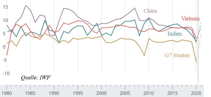 Nicht nur, dass einige asiatischen Länder dieses Jahr positiv abschneiden und somit wieder gut rauskommen aus der aktuellen Coronakrise. Die ganze Region soll auch nächstes Jahr am besten im Wachstum abschneiden. Im Schnitt 7,4 % und somit deutlich besser als die restlichen Regionen. Als Vergleich sollen die G7 Staaten vergleichsweise geringere 4,5 % wachsen.