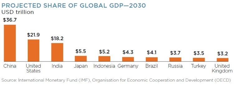 Wohin das starke asiatische Wachstum zukünftig führt, zeigt die Langzeitprognose vom IWF: China wird im Jahr 2030 deutlich an erster Stelle vom GDP stehen. USA ist lediglich auf Platz zwei. Dritten Platz soll dann Indien belegen.