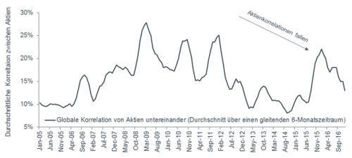 Grafik 1: Dispersion der Aktienerträge nimmt zu, Fundamentaldaten rücken wieder in den Fokus. Verdeutlicht den Durchschnitt der globalen Korrelation von Aktien untereinander über einen gleitenden 6-Monatszeitraum.