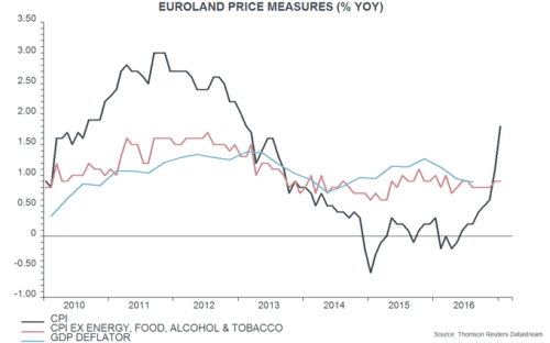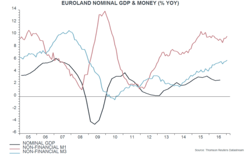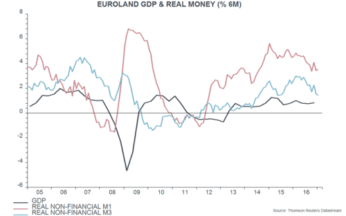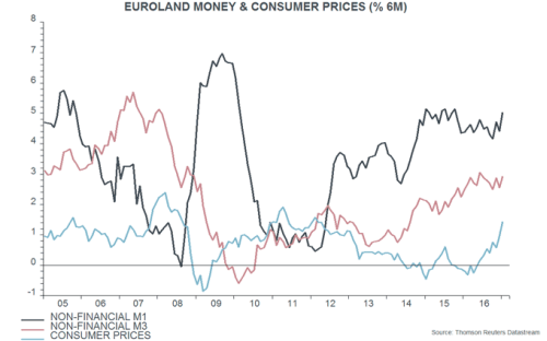 Six-month real non-financial M1 growth is around the middle of its range over the past three years, a period during which GDP expansion has averaged 1.7% per annum – a reasonable expectation for the pace of growth over the next two to three quarters. Such growth would be above “potential” economic expansion estimated by the EU Commission, IMF and OECD at 1.0-1.2% in 2017, implying a further fall in unemployment.