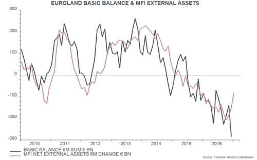 A recent post noted that the euro exchange rate was depressed in 2016 by a record outflow of direct and portfolio investment – this outflow swamped a rising current account surplus, resulting in a large “basic balance” deficit. The post suggested that the outflow would slow in 2017, partly reflecting QE “tapering”, supporting the euro. This slowdown may have begun, judging from data on the net external asset position of monetary financial institutions (MFIs): the change in such assets mirrors the basic balance and the decline in the six months to January was the smallest for a year – fifth chart.