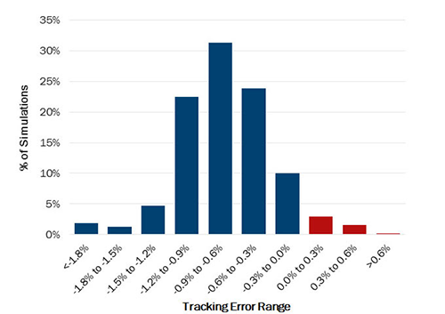 Tracking error: More importantly, due to the low correlation of Intech’s alpha source to more traditional approaches, the tracking error of the three-fund portfolio was decreased by including the Intech fund in 95% of cases.![]()