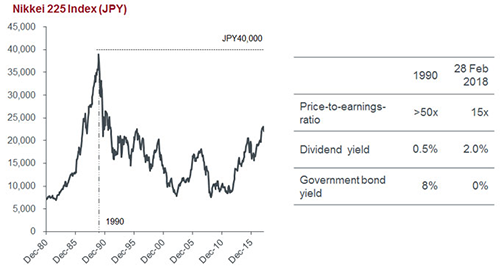 (Source: Bloomberg, Janus Henderson Investors. Nikkei 225 Index monthly data from 31 December 1980 to 28 February 2018. Yields may vary and are not guaranteed, past performance is not a guide to future performance.)
