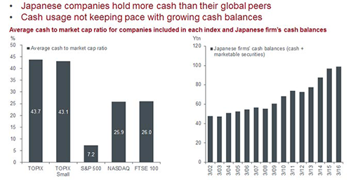 A key tenet of the Japanese Smaller Companies Strategy is that we focus on seeking to invest in companies that are improving corporate governance standards and rewarding shareholders. We continue to see a significant positive shift in corporate culture since Prime Minister Shinzo Abe’s introduction of the corporate governance code in 2015. Abe’s solid victory in the October 2017 snap election looks set to ensure this becomes a continuing trend. Meanwhile, corporate reform is being boosted by the increasingly large cash piles of Japanese companies (see chart 2); indeed this is providing ample opportunities for shareholders to benefit from rising dividend payments and share buybacks.