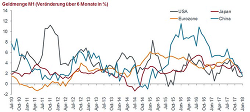 (Quelle: Thomson Reuters DataStream, Stand: 28. Februar 2018. M1 ist eine Standardgröße der Geldmenge und beinhaltet das im Umlauf befindliche Bargeld.)