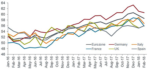 (Quelle: Bloomberg, Stand: 28. Februar 2018. Beinhaltet vorläufige Schätzungen für Februar 2018. PMI-Werte über 50 deuten auf Wirtschaftswachstum und Werte unter 50 auf eine schrumpfende Wirtschaft hin.)